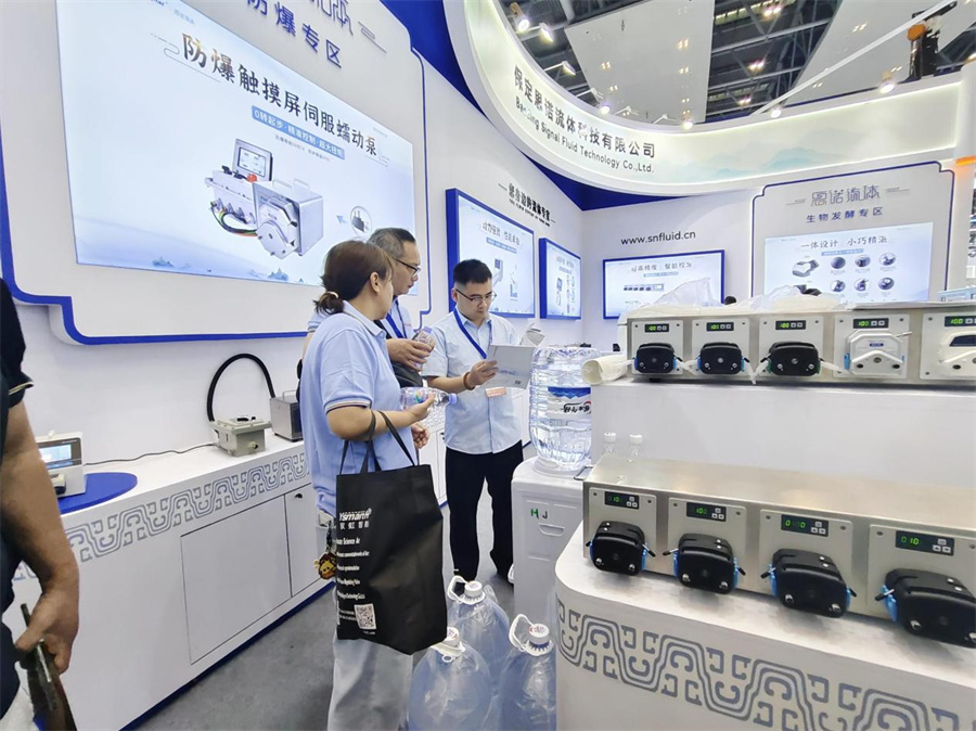 保定思諾流體科技有限公司的展位前人頭攢動,特別是其展示的AI智能蠕動泵能接入AI智能語音系統,實現萬物智聯,智能體驗讓AI解放雙手,還能實現全數據本地與云存儲,讓復雜控制的應用變得簡單易操作。新研發的具有高防爆和高防護等級的防爆觸摸屏伺服蠕動泵,0轉起步,高精度控制,擁有專業防爆觸摸屏,采用伺服防爆電機,體形小巧,動力強勁,震動小,噪音低,精簡的界面讓操作更便捷。同時還有調速模式、定速定量兩種控制模式可以自由切換。
