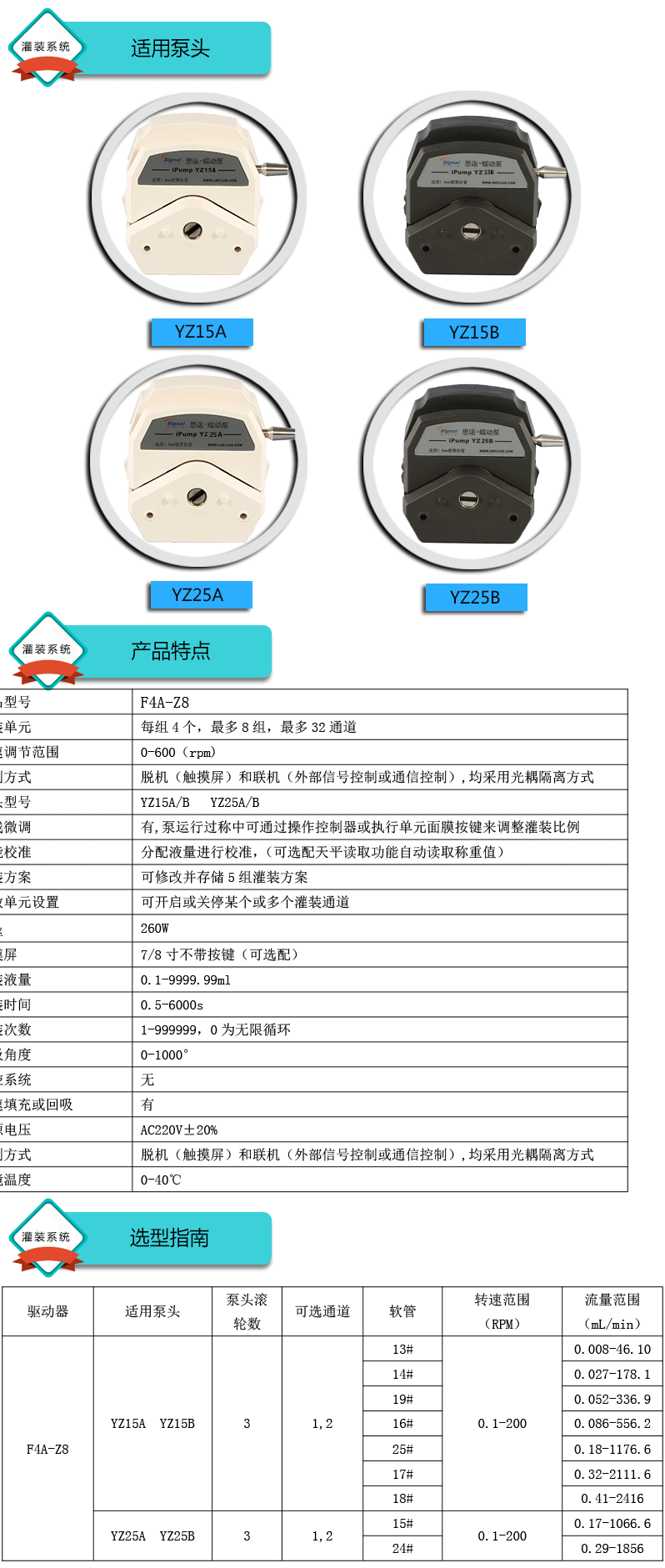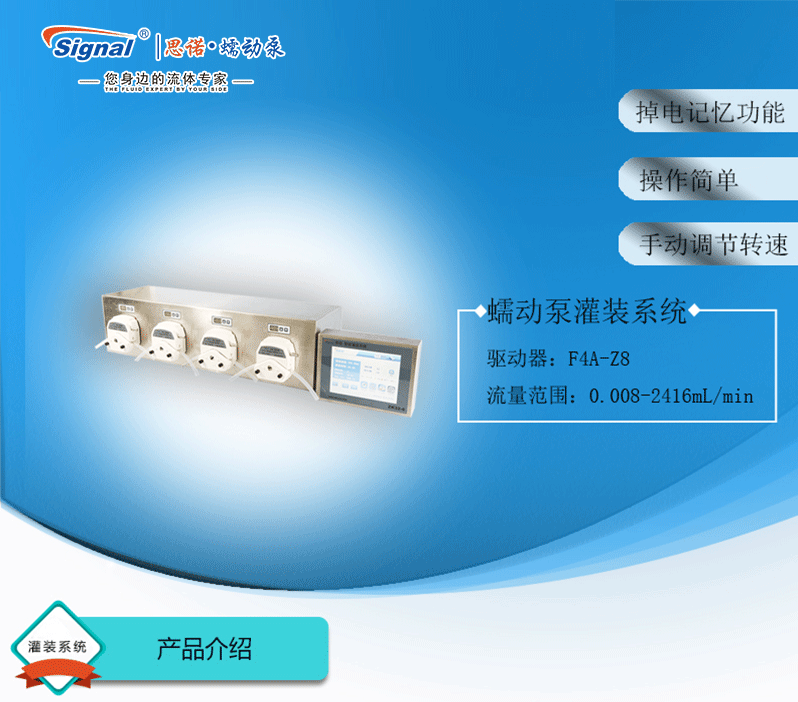 灌裝系統(tǒng)由4組基本通道(可擴展至32通道),一臺控制器組成,可安裝YZ15、YZ25泵頭